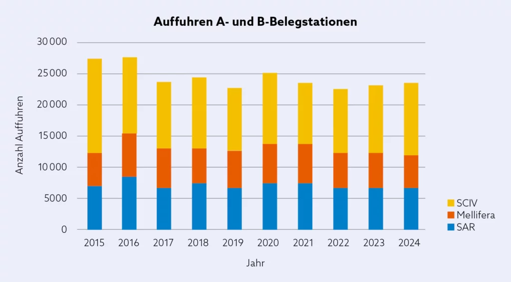 Im vergangenem Zuchtjahr 2024 betrieben die drei apisuisse angeschlossenen Rassenzuchtorganisationen (SAR, mellifera.ch und SCIV) insgesamt 18 A-Belegstationen (zwei weniger als im Vorjahr) und 32 B-Belegstationen (gleich viele wie 2023), welche mit Beiträgen des Bundesamtes für Landwirtschaft (BLW) unterstützt wurden.