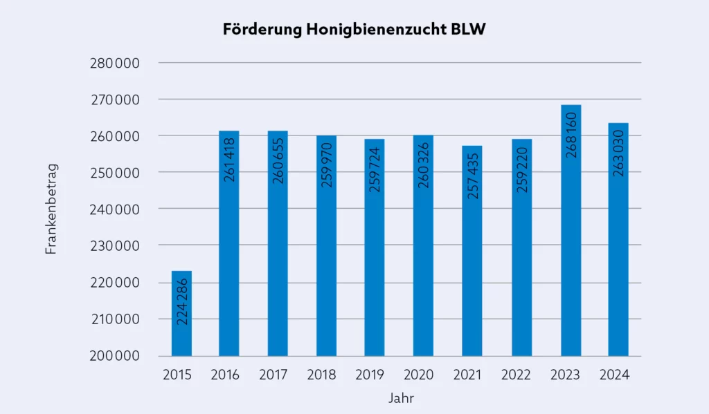 Gemäss der geltenden schweizerischen Tierzuchtverordnung standen zur Förderung der Honigbienenzucht 0,8% des gesamten Tierzuchtbudgets zur Verfügung. Für das Jahr 2024 entsprach dies CHF 263 030.– Die SAR erhielt für ihre Zuchtanstrengungen davon CHF 60 254.51, mellifera.ch CHF 85 584.79, die SCIV CHF 55 159. 84. Von den verbleibenden 62 030.86 CHF wurden CHF 8057.10 für die Zuchtwertberechnung aufgewendet und für die Fachstelle Zucht von apisuisse CHF 53 973. 76. Aufgrund von zeitaufwändigen Vorbereitungen im Zusammenhang mit der Tierzuchtverordnung 2026, musste der Anteil der Fachstelle Zucht im vergangenen Jahr von 15 auf 20,52 % erhöht werden.