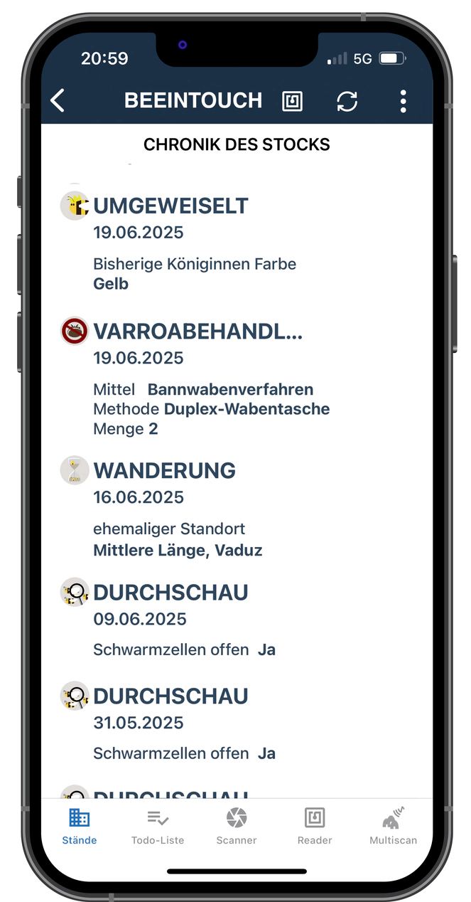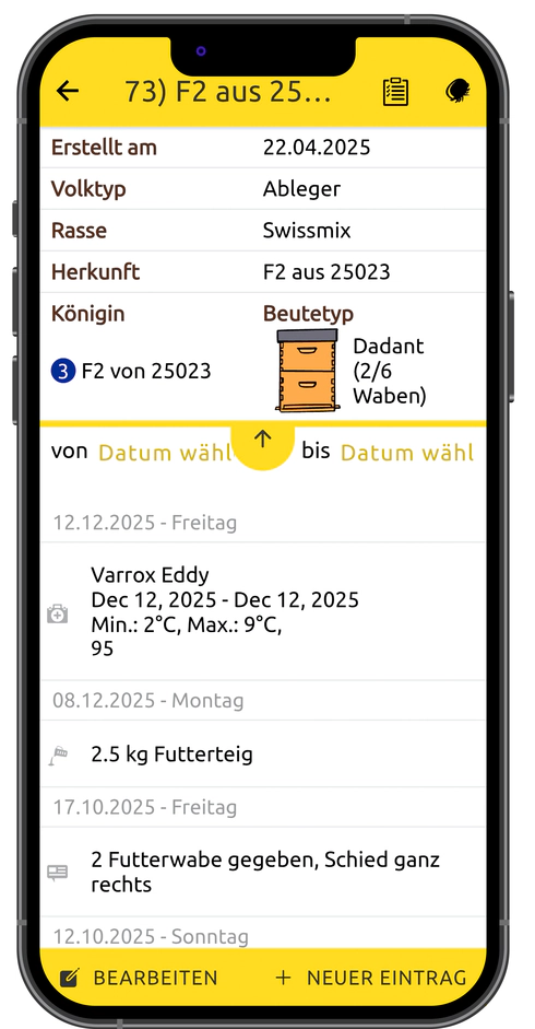 - Die Dokumentation der einzelnen Völker wird pro Bienenstand erfasst und ist sehr übersichtlich gelöst. Mit einem Blick sehe ich die Jahresfarbe der Königin und ihre Nummer sowie die Herkunft. Zusätzlich lassen sich kurze Infos zum Volk erfassen.