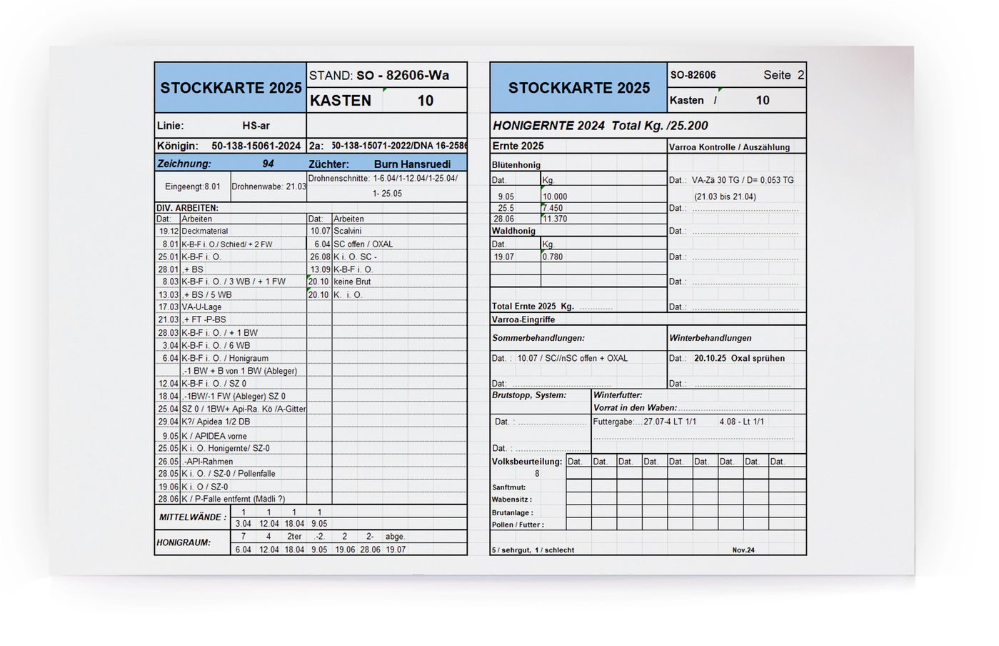 Die Stockkarte bildet das Archiv eines jeden Volkes. Kein Imker kann sich alle Arbeiten und Feststellungen von jedem Volk über die ganze Saison merken, unabhängig von der Anzahl Völker, die er pflegt! Wir werfen vor jedem Eingriff bei allen Völkern einen kurzen Blick auf die Stockkarte, sodass wir wissen, was wir bei den Völkern in der Vergangenheit festgestellt hatten. Wir haben unsere eigene Stockkarte, die wir von Jahr zu Jahr nach Bedarf ergänzen oder anpassen. Sie besteht aus einer Excel-Liste, die sowohl manuell auf Papier wie auch elektronisch geführt werden kann. Das Format ist A4 gefaltet, also A5, und hängt an der Kastentüre bzw. in einem Plastikmäppchen unter dem Deckel der Magazine. Auf beiden Seiten sind die Angaben zur Königin, die Arbeiten, Honig-Erträge, Varroa-Eingriffe und -Behandlungen sowie die Volksbeurteilung aufgeführt. Auf der Innenseite des Faltblattes notieren wir die Daten der Winterfütterung, die Art der Varroa-Behandlung des Vorjahres sowie die Varroa-Auszählung. Zudem hat es noch Platz für eine Legende unserer Abkürzungen.
